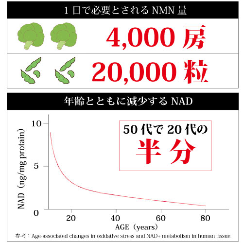 NMN は、体内でNAD というエネルギーを産生するための酵素に変化します。NAD は、若いうちは体内に多く存在していますが、年齢を重ねると若い頃の半分程度になってしまいます。