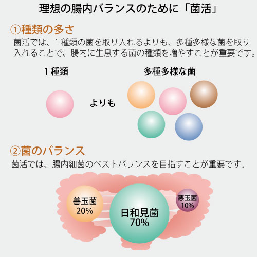 1種類の菌を取り入れるよりも、多種多様な菌を取り入れることで、腸内に生息する菌の種類を増やすことが重要です。
